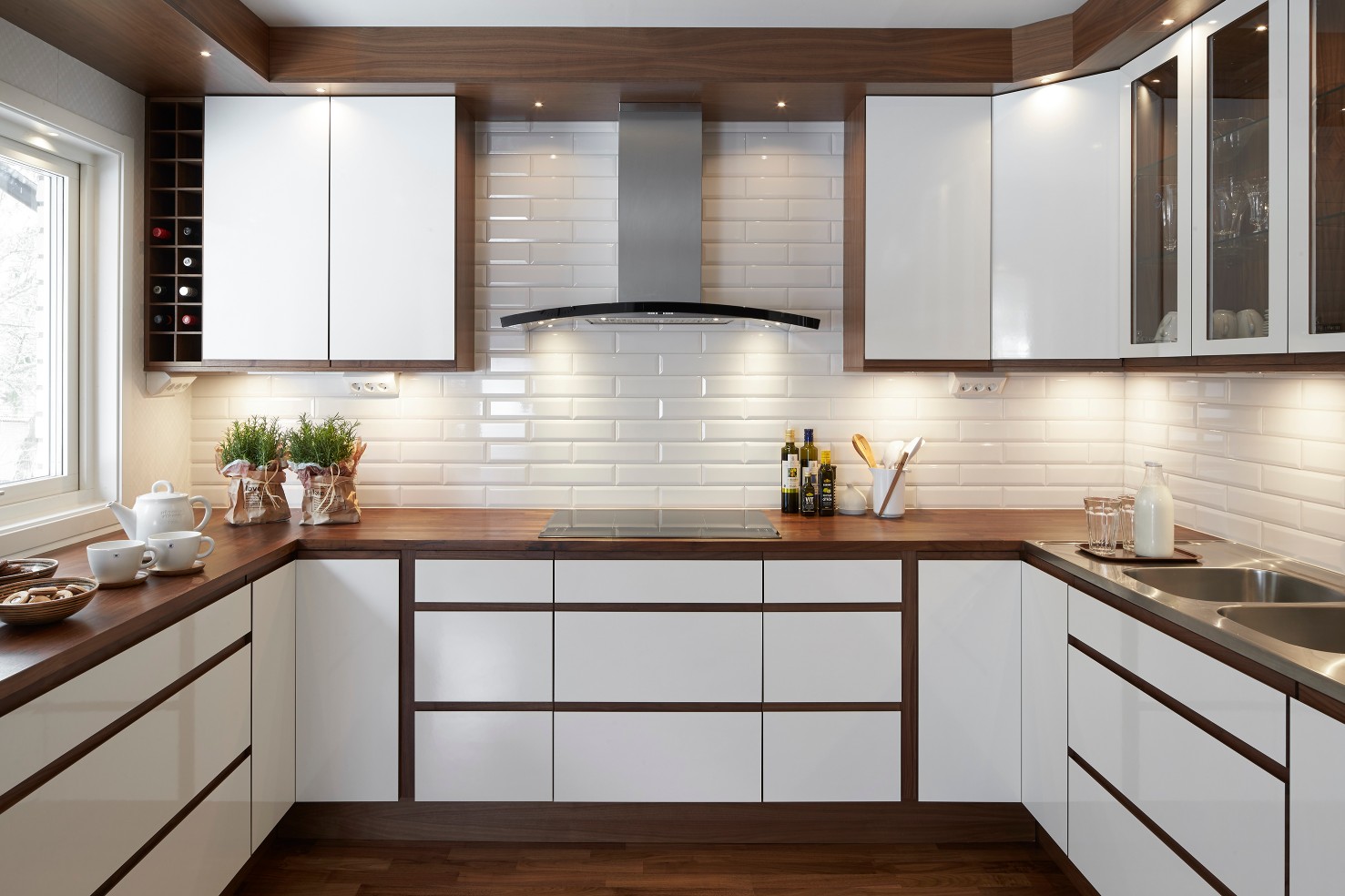Option Grepp ger ett funktionellt kök med fantastiska möjligheter att skapa sin egen stil. Här har man valt kontrasten mellan det vita, högblanka och den varma vackra valnöten. Laminaten går att få i flera olika färger och trälisten finns även i ek.
